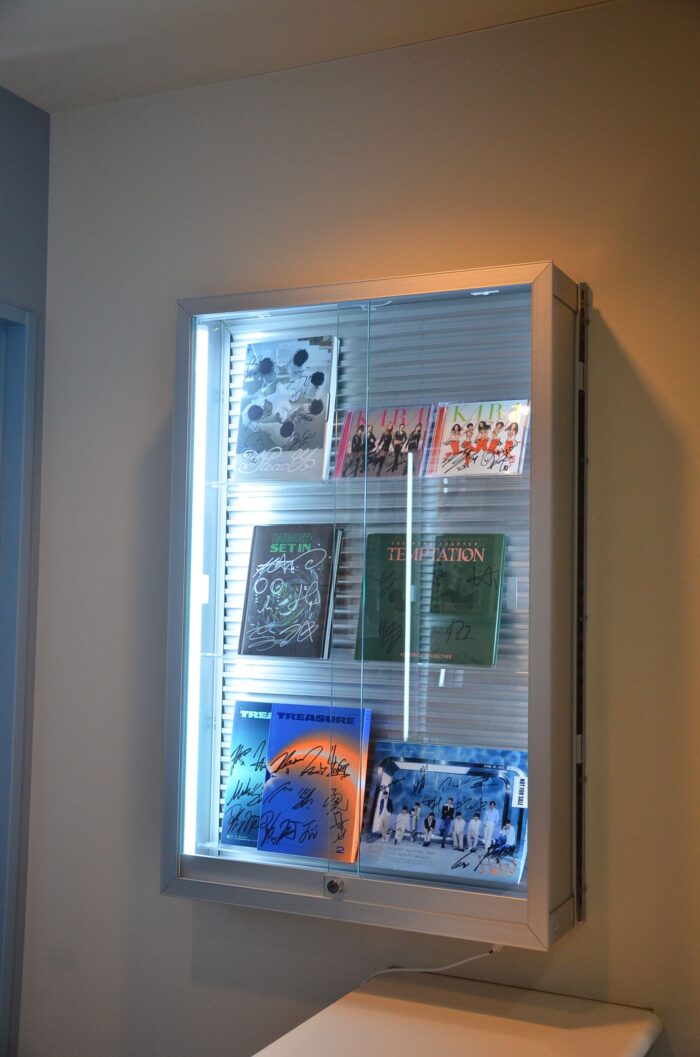 こちらのケース内には、ゆかりのあるアーティストの作品が並べられているそうです。生徒さんたちのモチベーションにもなりますね。
