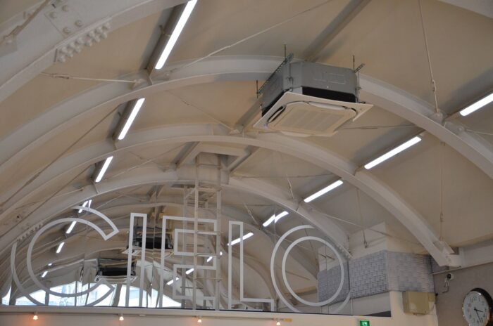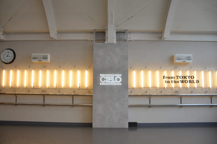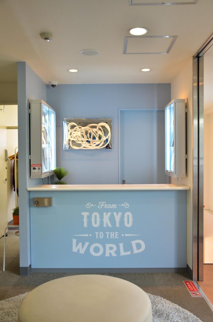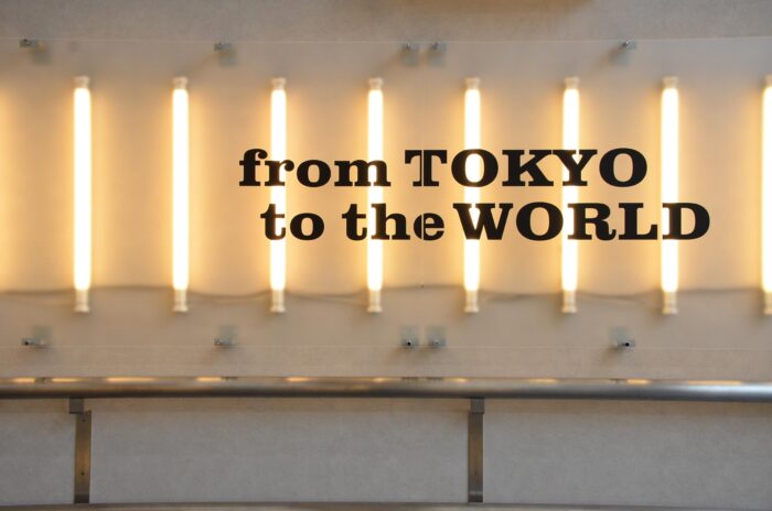 新たに造作した壁面風サインにロゴマークをLEDで光らせ、半透明のパネルを淡く光からせメッセージを浮かび上がらせます。「from TOKYO to the WORLD」