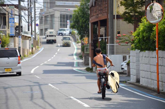 お店の前を歩く人や、自転車で通り過ぎるサーファー。