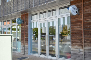 店頭には、最初に作らせていただいたバーガーモチーフのロゴマークを使用した、電飾パネルにフラッグサイン。インパクトあるハンバーガーのデザインとメニューを表記したスタンドサイン。窓ガラスのゴールドのシート。