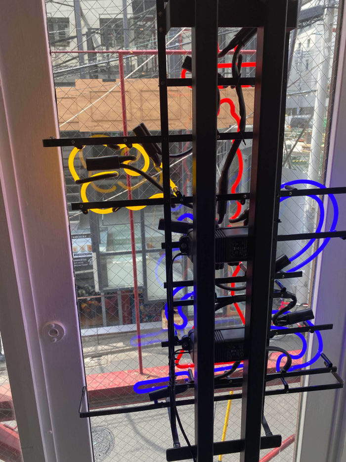店内のガラス窓に設置したカラフルなネオン管サインでお出迎え。