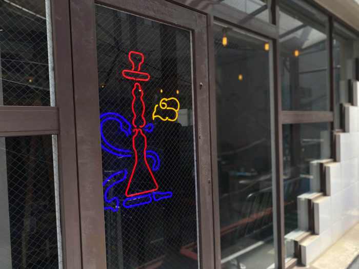 こちらでは、ロゴと水タバコイラストのネオンサイン・古材を使用したA型看板、袖看板などをお手伝いさせて頂きました。